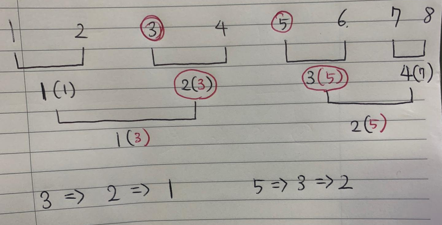 8명이 토너먼트에 참가했다고 가정하고 우리가 찾아야할 참가자 번호가 3, 5 라고 해보자.