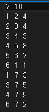 첫째 줄에 정점의 개수 V(1 ≤ V ≤ 10,000)와 간선의 개수 E(1 ≤ E ≤ 100,000)가 주어진다. 다음 E개의 줄에는 각 간선에 대한 정보를 나타내는 세 정수 A, B, C가 주어진다. 이는 A번 정점과 B번 정점이 �