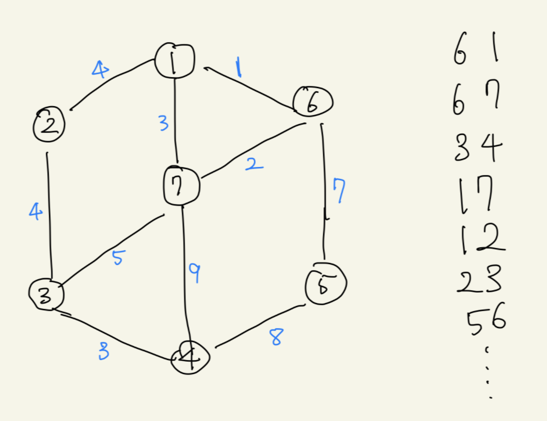간선의 정보를 가중치로 오름차순 정렬하여 오른쪽에 적어두었다.