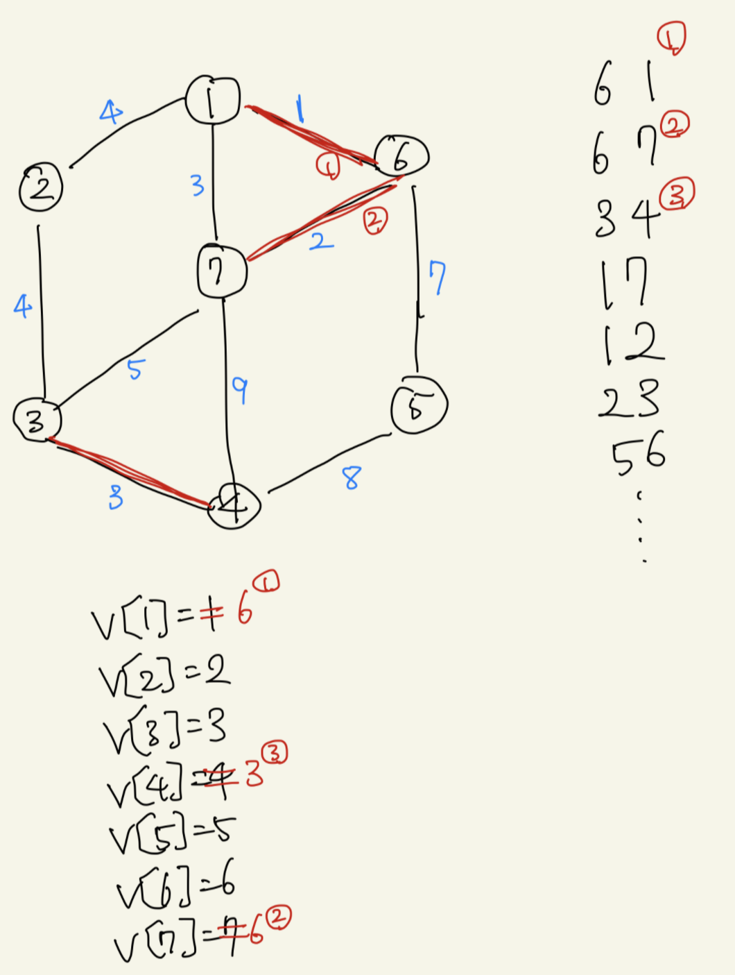 간선의 정보를 가중치로 오름차순 정렬하여 오른쪽에 적어두었다.