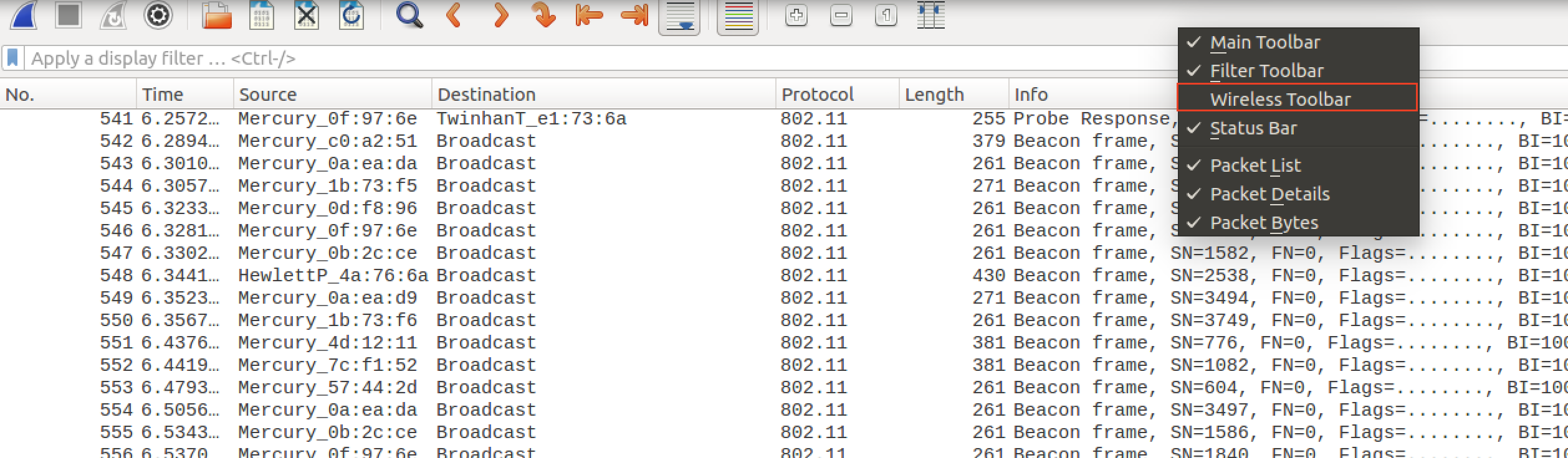 와이어샤크 필터있는 쪽 공백에서 우클릭을 하면 wireless Toolbar를 켤 수있다. 클릭해서 체크를 진행해보자