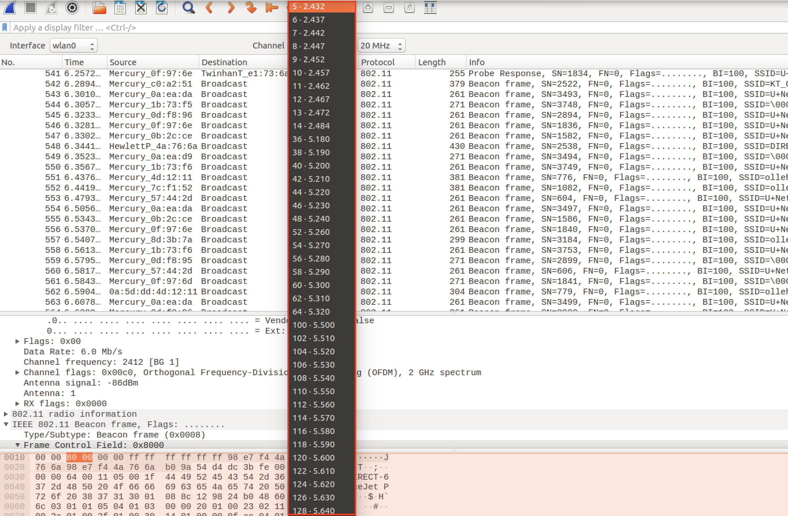 wireshark에서 wireless 무선 즉 IEEE802.11 Frame 패킷을 잡아보면 특정 채널에 한해서 프레임이 잡히는 것을 알 수있다.