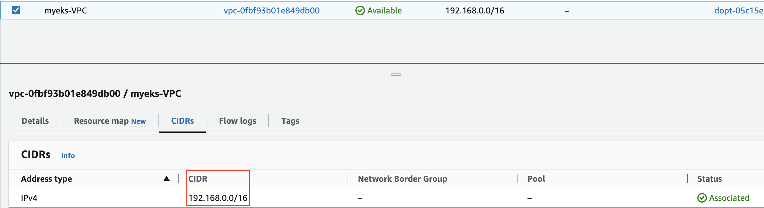 aws ec2 describe-vpcs --filters "Name=isDefault,Values=false" \ --query 'Vpcs[*].{id:VpcId,cidr:CidrBlock}';kubectl get node,pod -o wide