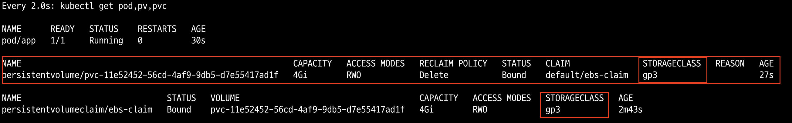 cat <<EOT > awsebs-pvc.yaml apiVersion: v1 kind: PersistentVolumeClaim metadata: name: ebs-claim spec: accessModes: - ReadWriteOnce resources: requests: storage: 4Gi storageClassName: gp3 EOT kubectl apply -f awsebs-pvc.yaml