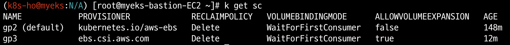cat <<EOT > gp3-sc.yaml kind: StorageClass apiVersion: storage.k8s.io/v1 metadata: name: gp3 allowVolumeExpansion: true # 자동 볼륨 확장 provisioner: ebs.csi.aws.com volumeBindingMode: WaitForFirstConsumer parameters: type: gp3 allowAutoIOPSPerGBIncrease: 'true' encrypted: 'true' # Volume 암호화 옵션 #fsType: ext4 # 기본값이 ext4 이며 xfs 등 변경 가능 >> 단 스냅샷 경우 ext4를 기본으로하여 동작하여 xfs 사용 시 문제가 될 수 있음 - 테스트해보자 EOT