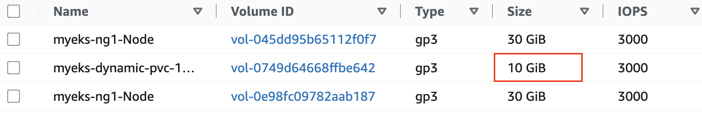 EBS volume이 추가된 것을 확인할 수 있었다. => AWS GUI에서도 PVC에 명시했던 gp3 StorageClass의 4GiB 짜리 Volume이 생성된 것을 확인할 수 있었다.