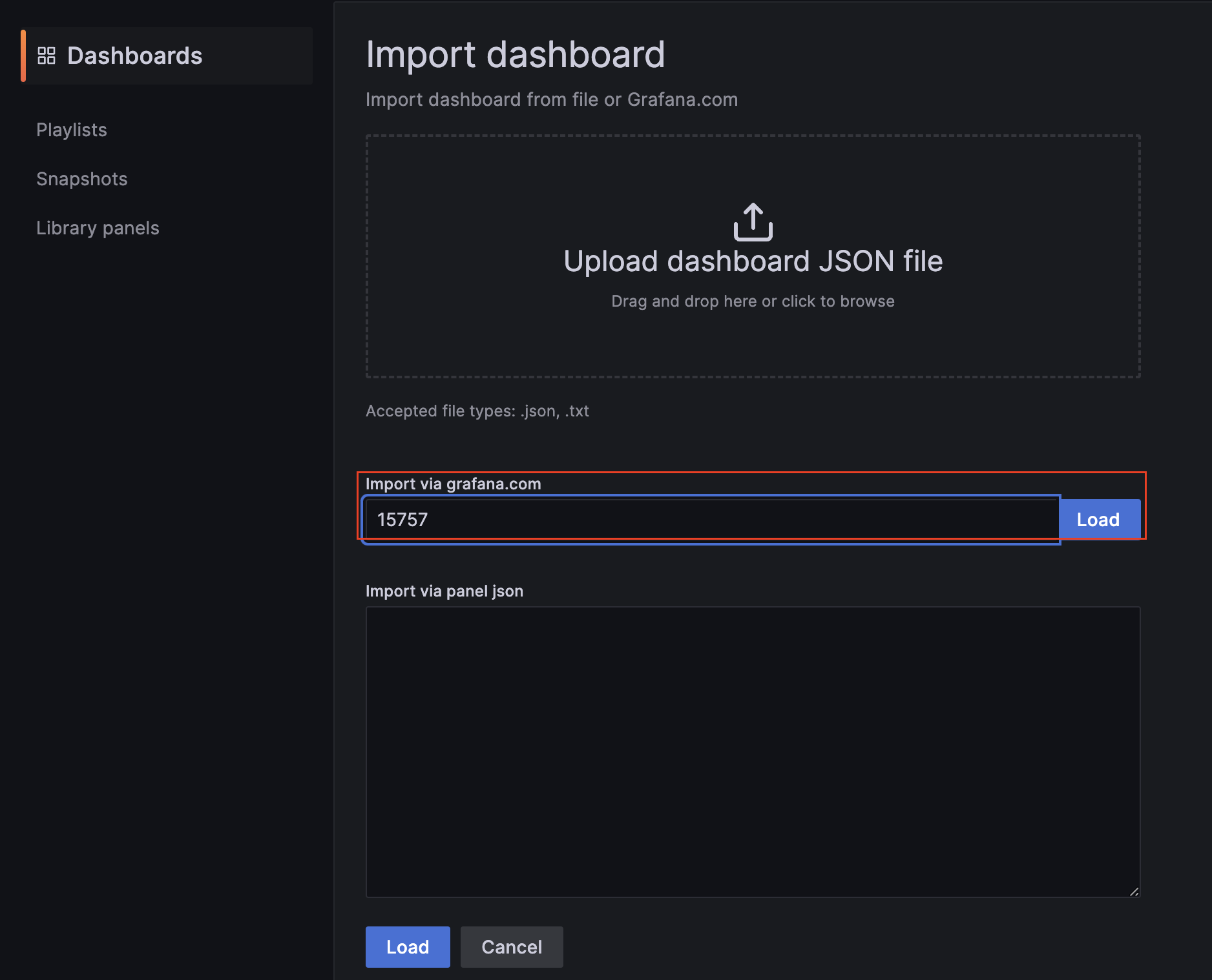 Grafana Dashboad에 ID:15757 Dashboad 적용화면 => Grafana 대시보드 적용은 굉장히 간단한게 만들어져있다. 공식 대시보드 페이지에서 원하는 대시보드의 ID만 입력하면 위의 사진처럼 적용이 가능하다.