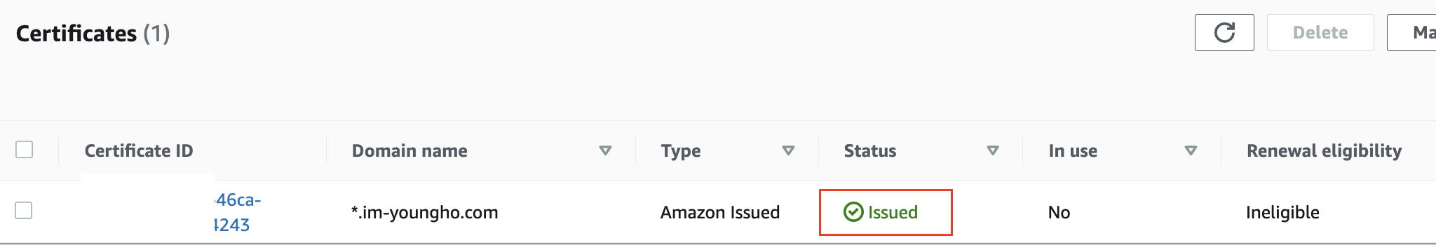 certificates request => 해당 내용 진행전 SSL 통신에 사용될 certificate가 필요했다. 다행히 AWS의 Certificate Manager로 생성한 인증서는 무료라고한다. 나는 Route 53을 통해 Domain을 구매해놨기 때문에 해당 Domain으로 request 해두었다!! 시간이 조금 걸린다(대략 10~15분??)