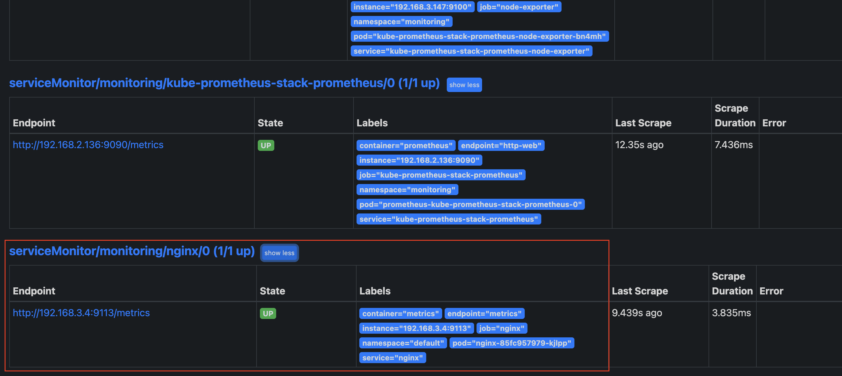 cat <<EOT > ~/nginx_metric-values.yaml metrics: enabled: true service: port: 9113 serviceMonitor: enabled: true namespace: monitoring interval: 10s EOT helm upgrade nginx bitnami/nginx --reuse-values -f nginx_metric-values.yaml
