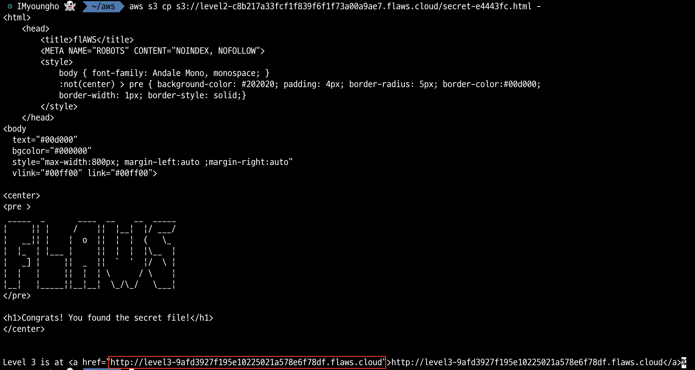 aws s3 cp s3://level2-c8b217a33fcf1f839f6f1f73a00a9ae7.flaws.cloud/secret-e4443fc.html -