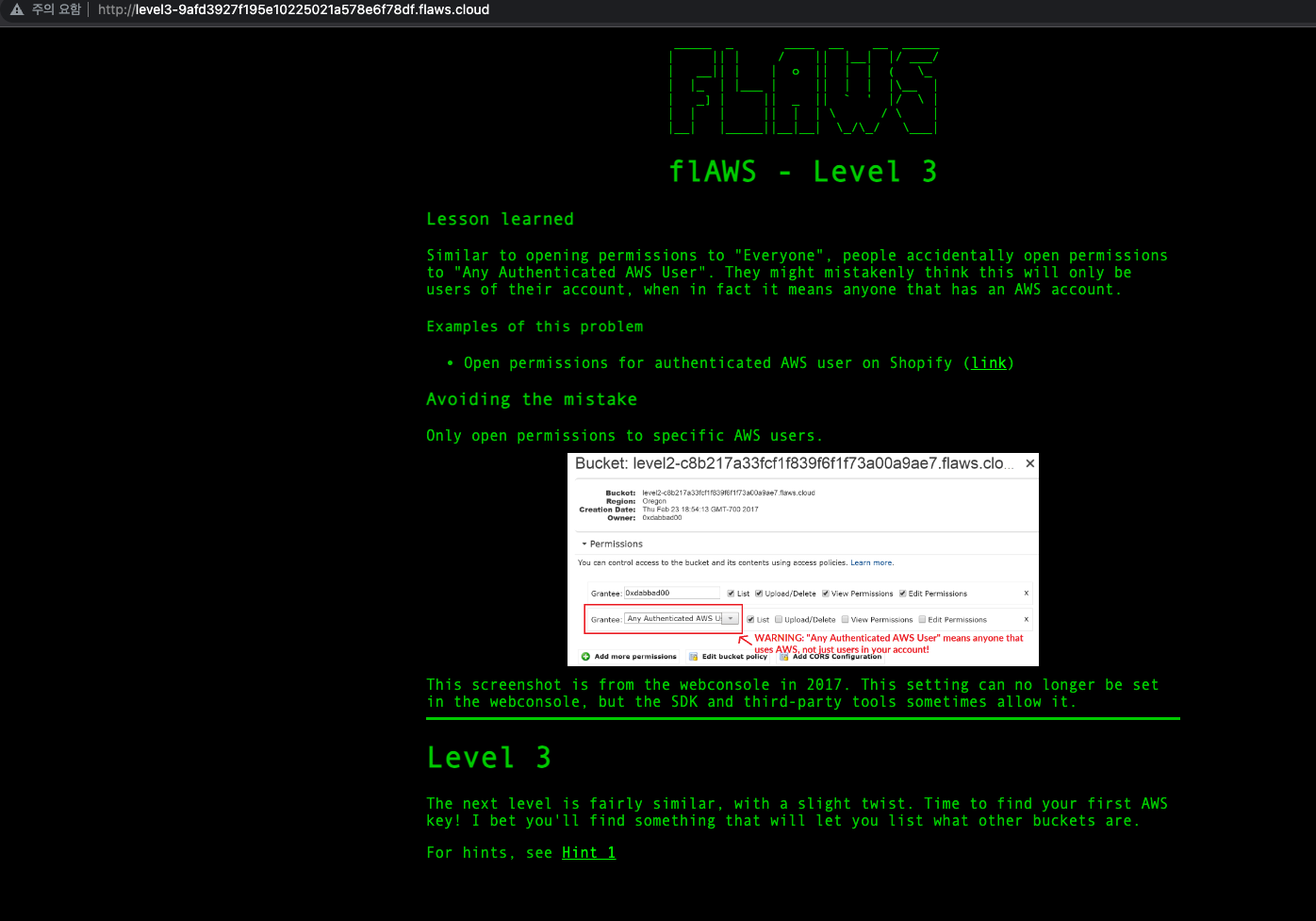 => 문제에서 정말 예고한대로 살짝만 꼬았다..Everyone -> Any Authenticated AWS User로...크흠.. 심지어 문제 풀이시에 aws cli에 credential이 이미 설정되어있었다면 뭐가 다른지 알아채지도 못했을 것 같다..ㅋㅋ