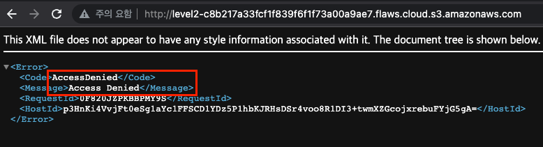 => aws cli로 접근하기전에 URL로 접근을 시도해보았더니 Access Denied가 나왔다. 1번문제의 flaws.cloud bucket의 경우 everyone으로 List가 가능하게 설정이 되어있어 누구나 접근이 가능했던 것으로 보인다.