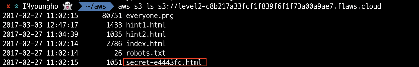 aws s3 ls s3://level2-c8b217a33fcf1f839f6f1f73a00a9ae7.flaws.cloud