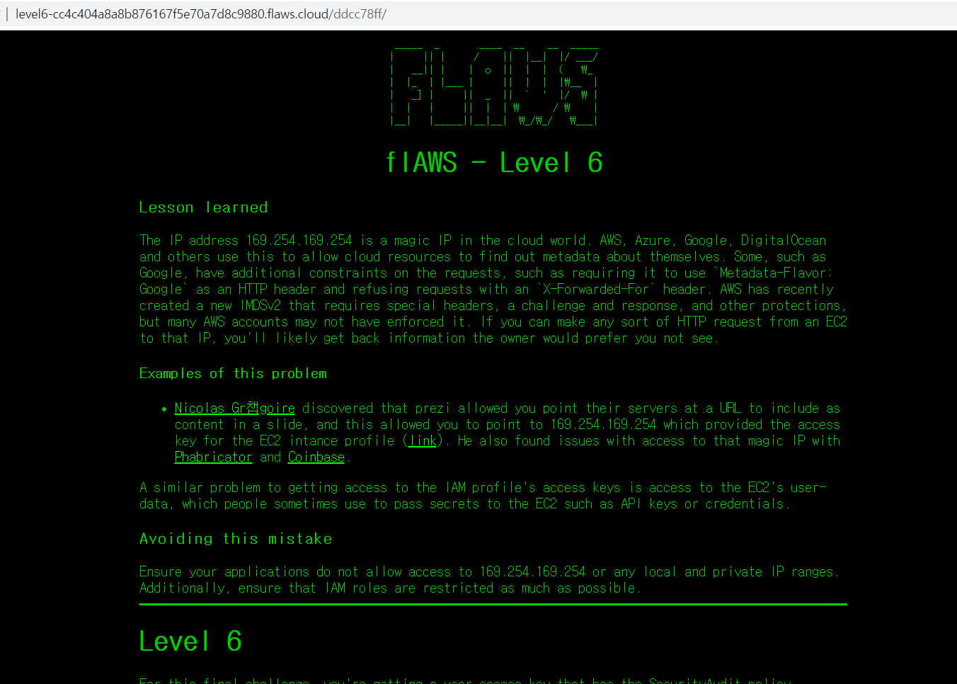 => 다음 Level로 갈 수 있게 되었다. 169.254.169.254 IP를 활용하여 Instance의 metadata를 받아오는 것을 시작으로 문제를 풀 수 있었다. 따라서 해당 metadata에 대한 요청은 되도록이면 클라우드 내부에서만 요청가능하도록 설정해야하며 metadata 서비스를 호출할 수 있는 애플리케이션 또는 프로세스를 필요에 따라 제한하는 등의 관리가 필요할 것으로 보여진다.