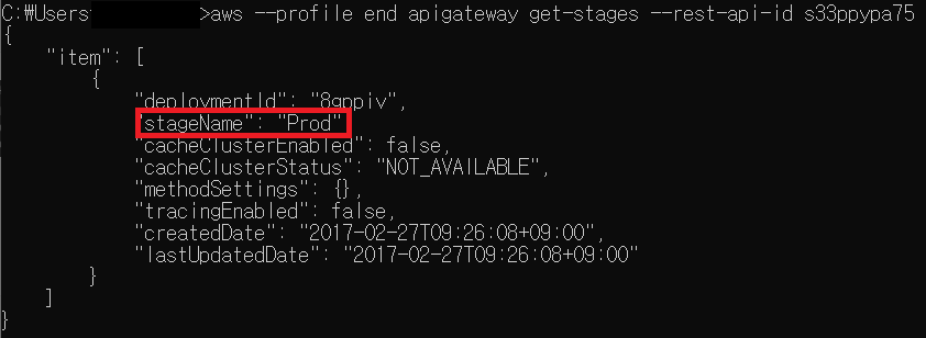 aws --profile end apigateway get-stages --rest-api-id s33ppypa75