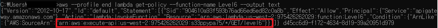 => Lambda 함수에 대한 IAM policy 확인을 통해 execute-api ARN을 알 수 있었고 execute-api ARN내의 "s33ppypa75"값이 바로 rest-api-id이므로 REST API호출에 필요한 rest-api-id를 얻을 수 있었다. 또한 리소스 경로가 "/level6" 이라는 것도