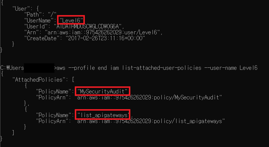 aws --profile end iam get-user aws --profile end iam list-attached-user-policies --user-name Level6