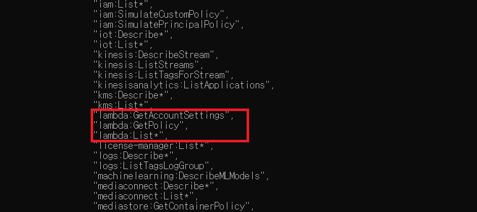 더보기{ "PolicyVersion": { "Document": { "Version": "2012-10-17", "Statement": [ { "Action": [ "acm:Describe*", "acm:List*", "application-autoscaling:Describe*", "athena:List*", "autoscaling:Describe*", "batch:DescribeComputeEnvironments", "batch:DescribeJobDefinitions", "clouddirectory:ListDirectories", "cloudformation:DescribeStack*", "cloudformation:GetTemplate", "cloudformation:ListStack*", "cloudformation:GetStackPolicy", "cloudfront:Get*", "cloudfront:List*", "cloudhsm:ListHapgs", "cloudhsm:ListHsms", "cloudhsm:ListLunaClients", "cloudsearch:DescribeDomains", "cloudsearch:DescribeServiceAccessPolicies", "cloudtrail:DescribeTrails", "cloudtrail:GetEventSelectors", "cloudtrail:GetTrailStatus", "cloudtrail:ListTags", "cloudwatch:Describe*", "codebuild:ListProjects", "codedeploy:Batch*", "codedeploy:Get*", "codedeploy:List*", "codepipeline:ListPipelines", "codestar:Describe*", "codestar:List*", "cognito-identity:ListIdentityPools", "cognito-idp:ListUserPools", "cognito-sync:Describe*", "cognito-sync:List*", "datasync:Describe*", "datasync:List*", "dax:Describe*", "dax:ListTags", "directconnect:Describe*", "dms:Describe*", "dms:ListTagsForResource", "ds:DescribeDirectories", "dynamodb:DescribeContinuousBackups", "dynamodb:DescribeGlobalTable", "dynamodb:DescribeTable", "dynamodb:DescribeTimeToLive", "dynamodb:ListBackups", "dynamodb:ListGlobalTables", "dynamodb:ListStreams", "dynamodb:ListTables", "ec2:Describe*", "ecr:DescribeRepositories", "ecr:GetRepositoryPolicy", "ecs:Describe*", "ecs:List*", "eks:DescribeCluster", "eks:ListClusters", "elasticache:Describe*", "elasticbeanstalk:Describe*", "elasticfilesystem:DescribeFileSystems", "elasticloadbalancing:Describe*", "elasticmapreduce:Describe*", "elasticmapreduce:ListClusters", "elasticmapreduce:ListInstances", "es:Describe*", "es:ListDomainNames", "events:DescribeEventBus", "events:ListRules", "firehose:Describe*", "firehose:List*", "fsx:Describe*", "fsx:List*", "gamelift:ListBuilds", "gamelift:ListFleets", "glacier:DescribeVault", "glacier:GetVaultAccessPolicy", "glacier:ListVaults", "globalaccelerator:Describe*", "globalaccelerator:List*", "greengrass:List*", "guardduty:Get*", "guardduty:List*", "iam:GenerateCredentialReport", "iam:Get*", "iam:List*", "iam:SimulateCustomPolicy", "iam:SimulatePrincipalPolicy", "iot:Describe*", "iot:List*", "kinesis:DescribeStream", "kinesis:ListStreams", "kinesis:ListTagsForStream", "kinesisanalytics:ListApplications", "kms:Describe*", "kms:List*", "lambda:GetAccountSettings", "lambda:GetPolicy", "lambda:List*", "license-manager:List*", "logs:Describe*", "logs:ListTagsLogGroup", "machinelearning:DescribeMLModels", "mediaconnect:Describe*", "mediaconnect:List*", "mediastore:GetContainerPolicy", "mediastore:ListContainers", "opsworks-cm:DescribeServers", "organizations:List*", "quicksight:Describe*", "quicksight:List*", "ram:List*", "rds:Describe*", "rds:DownloadDBLogFilePortion", "rds:ListTagsForResource", "redshift:Describe*", "rekognition:Describe*", "rekognition:List*", "robomaker:Describe*", "robomaker:List*", "route53:Get*", "route53:List*", "route53domains:GetDomainDetail", "route53domains:GetOperationDetail", "route53domains:ListDomains", "route53domains:ListOperations", "route53domains:ListTagsForDomain", "route53resolver:List*", "s3:ListAllMyBuckets", "sagemaker:Describe*", "sagemaker:List*", "sdb:DomainMetadata", "sdb:ListDomains", "securityhub:Get*", "securityhub:List*", "serverlessrepo:GetApplicationPolicy", "serverlessrepo:List*", "sqs:GetQueueAttributes", "sqs:ListQueues", "ssm:Describe*", "ssm:ListDocuments", "storagegateway:List*", "tag:GetResources", "tag:GetTagKeys", "transfer:Describe*", "transfer:List*", "translate:List*", "trustedadvisor:Describe*", "waf:ListWebACLs", "waf-regional:ListWebACLs", "workspaces:Describe*" ], "Resource": "*", "Effect": "Allow" } ] }, "VersionId": "v1", "IsDefaultVersion": true, "CreateDate": "2019-03-03T16:42:45+00:00" } }lambda — AWS CLI 1.29.5 Command Reference
