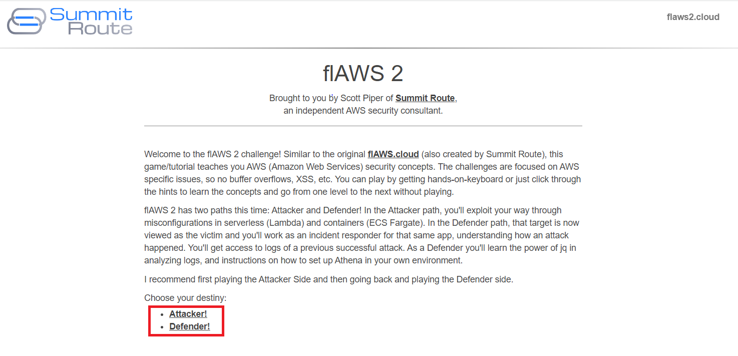 => 이번에 진행할 flAWS 2는 Attacker와 Defender로 나눠서 문제가 진행된다. 나는 우선 Attacker부터 진행했다.ㅎㅎ