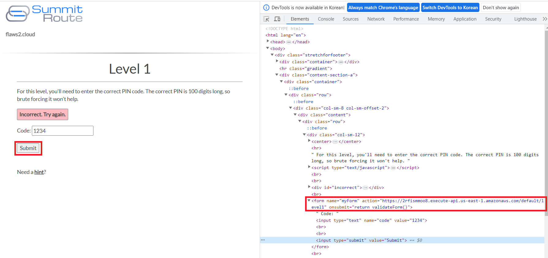 https://2rfismmoo8.execute-api.us-east-1.amazonaws.com/default/level1?code=1234