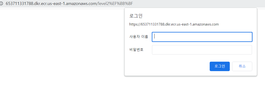 => 이번 문제는 ECR관련된 문제로 보여진다. 문제에서 제공된 링크에 접속 시, 계정정보를 물어본다. 딱봐도 계정정보를 알아내면 다음 Level로 가는 링크를 알려줄 것 같다. 문제에서 제공한 힌트는 ECR이름이 "level2"라는 것과 s3같이 open된 permission을 가진 AWS 리소스를 사용하라는 것 같다.