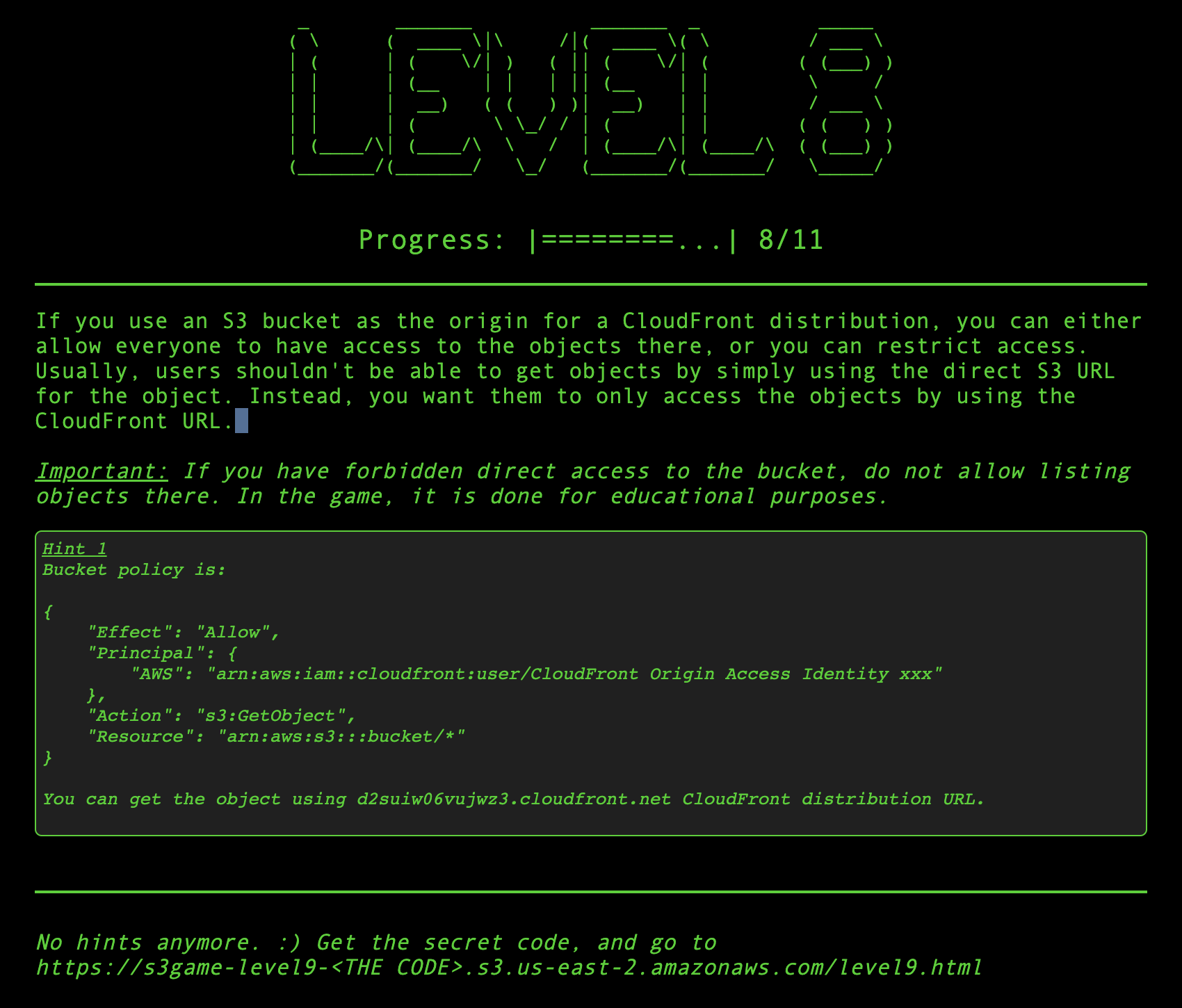 => 아주 손쉽게 CloudFront URL로 해당 object에 접근하여 다음 Level로 갈 수 있게 되었다~