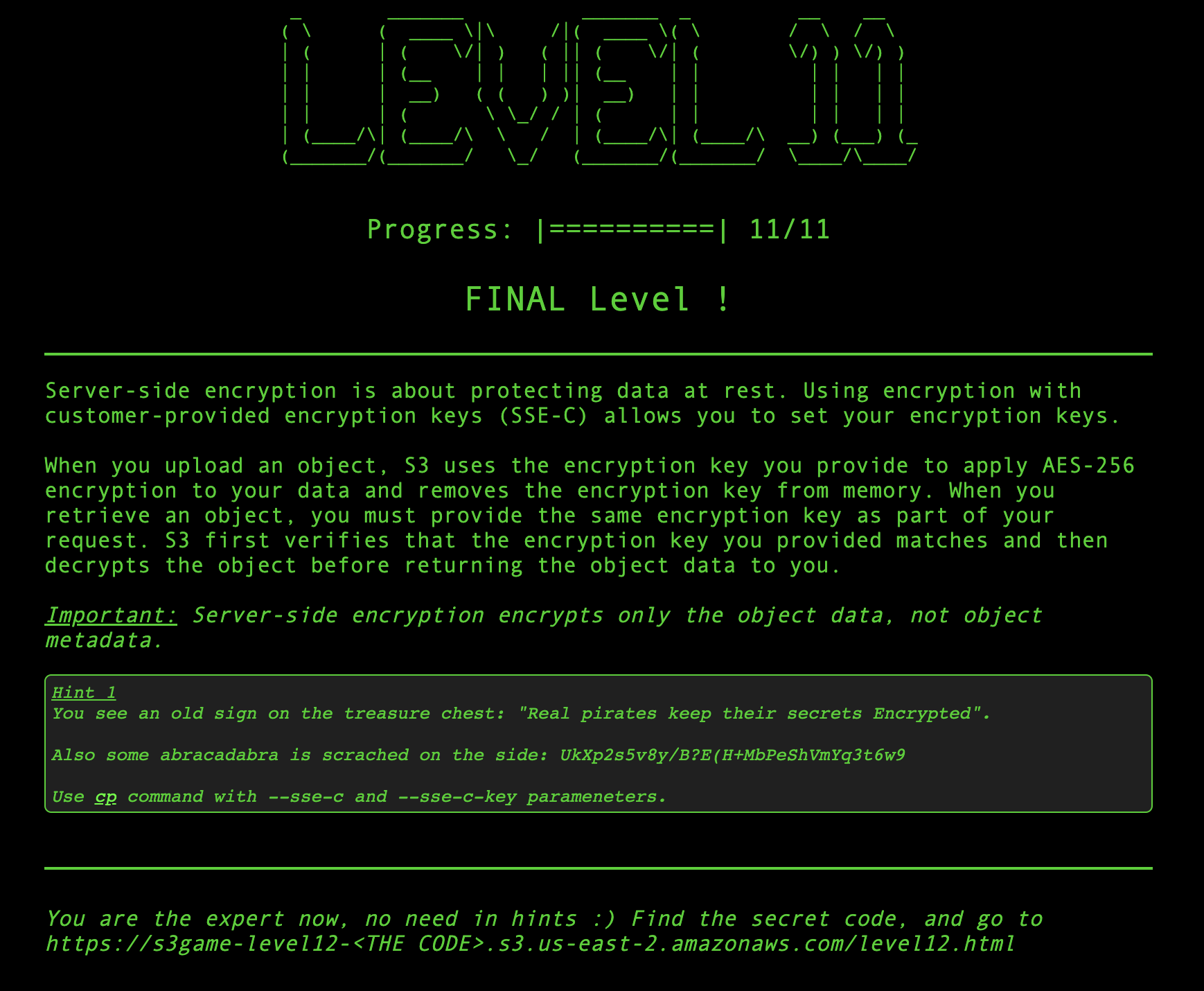 aws --profile test s3 cp s3://s3game-level11-djq30a807iyq/treasure11_encryption - --sse-c AES256 --sse-c-key "UkXp2s5v8y/B?E(H+MbPeShVmYq3t6w9"