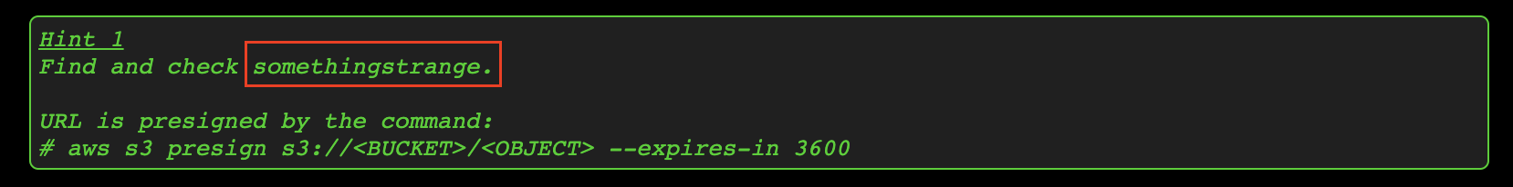 curl $(curl $(aws --profile test s3 presign s3://s3game-level7-zhovpo4j8588/somethingstrange --expires-in 3600))