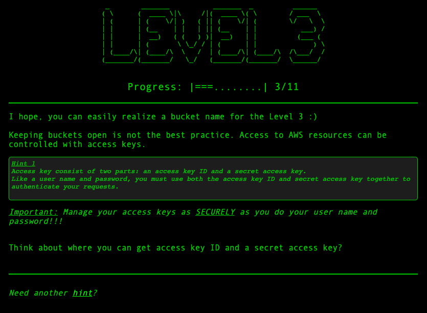 => Level2에서 줍줍한 credential을 사용해야한다는 것을 직감했다. 해당 credential만이 문제에서 제공하는 bucket에 접근할 수 있을 것 같다.
