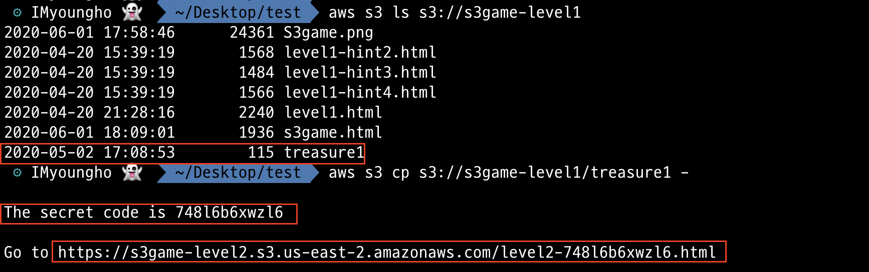 aws --profile test s3 ls s3://s3game-level4-k73045aztqln