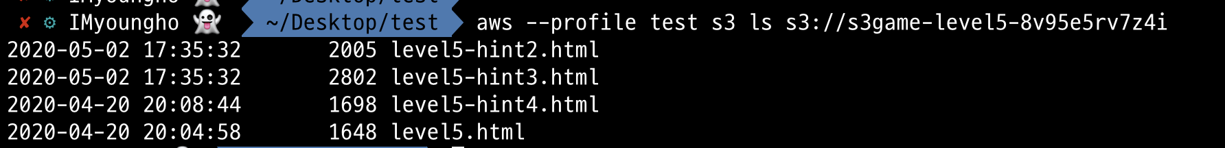 aws --profile test s3 ls s3://s3game-level5-8v95e5rv7z4i