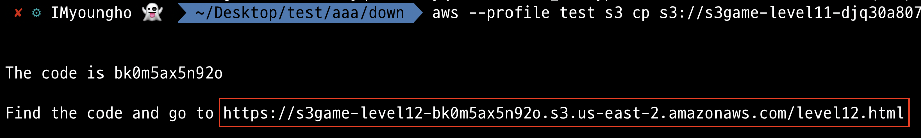 aws --profile test s3 cp s3://s3game-level10-gac6tf83erp6/djq30a807iyq -