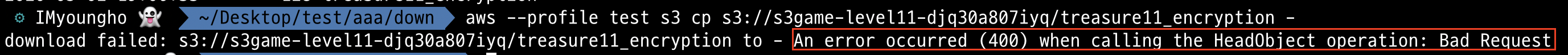 => 해당 bucket에는 treasure11_encrpytion이라는 의심스러운 object가 존재했다. 내용을 보고 싶었지만 400 Error로 (이렇게 간단하게 풀릴리가 없기 때문에) 당연히 실패했다. 그렇다면 문제에서 제공한 --sse-c랑 --sse-c-key 옵션을 통해 Server-side key값을 사용해보자.