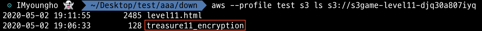aws --profile test s3 cp s3://s3game-level11-djq30a807iyq/treasure11_encryption -