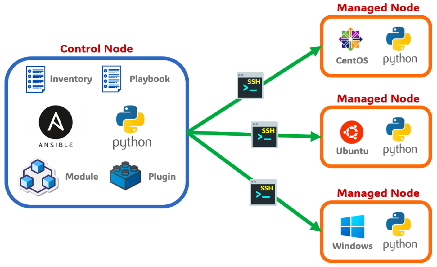 Ansible의 경우 관리노드에 Agent를 설치할 필요가 없으며 SSH를 통해 관리노드에 명령을 전달