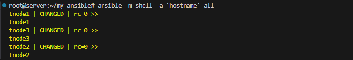 ansible -m shell -a 'hostname' all ansible -m shell -a 'pwd' all