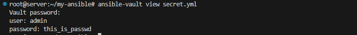 => 위에서 암호화한 파일의 내용을 해당 명령과 Vault 패스워드를 통해 확인할 수 있음