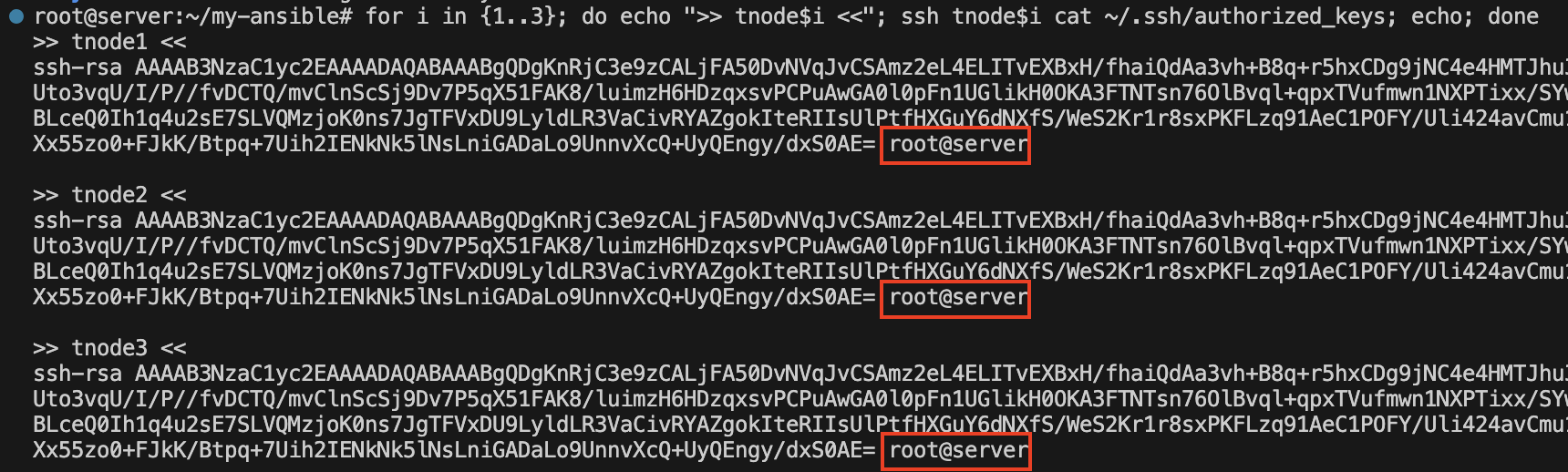 for i in {1..3}; do ssh-copy-id ubuntu@tnode$i; done for i in {1..3}; do echo ">> tnode$i <<"; ssh tnode$i cat /home/ubuntu/.ssh/authorized_keys; echo; done