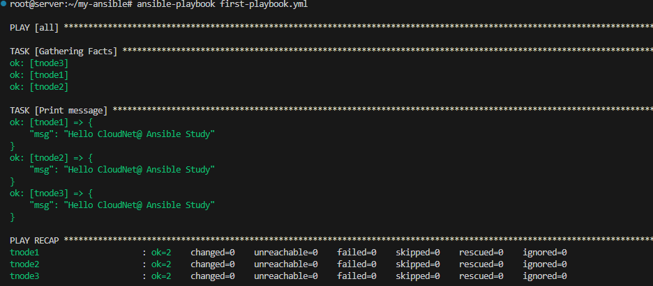 # first-playbook.yml --- - hosts: all tasks: - name: Print message debug: msg: Hello CloudNet@ Ansible Study=> 스터디에서 진행한 기본예제이다.