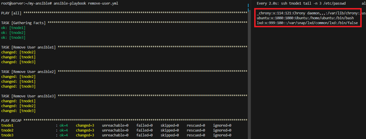 ansible-playbook remove-user.yml# remove-user.yml --- - hosts: all vars_files: - var_file.yml tasks: - name: Remove User {{ user1 }} ansible.builtin.user: name: "{{ user1 }}" state: absent - name: Remove User {{ user2 }} ansible.builtin.user: name: "{{ user2 }}" state: absent - name: Remove User {{ user3 }} ansible.builtin.user: name: "{{ user3 }}" state: absent