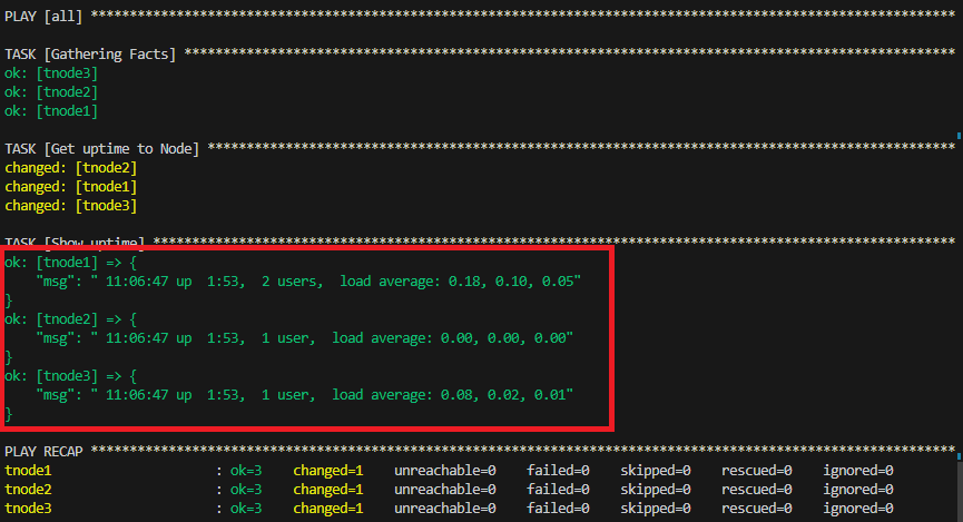 # uptime.yml --- - hosts: all tasks: - name: Get uptime to Node ansible.builtin.shell: /usr/bin/uptime register: result - name: Show uptime ansible.builtin.debug: msg: "{{ result.stdout }}"