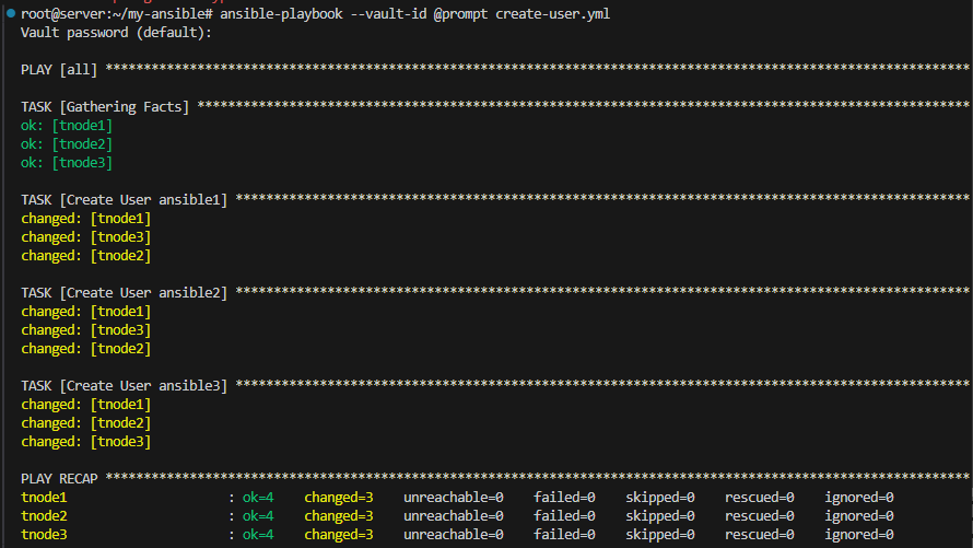 ansible-playbook create-user.yml# var_file.yml user1: ansible1 user2: ansible2 user3: ansible3 # create_user.yml --- - hosts: all vars_files: - var_file.yml tasks: - name: Create User {{ user1 }} ansible.builtin.user: name: "{{ user1 }}" state: present - name: Create User {{ user2 }} ansible.builtin.user: name: "{{ user2 }}" state: present - name: Create User {{ user3 }} ansible.builtin.user: name: "{{ user3 }}" state: present