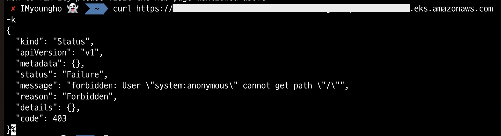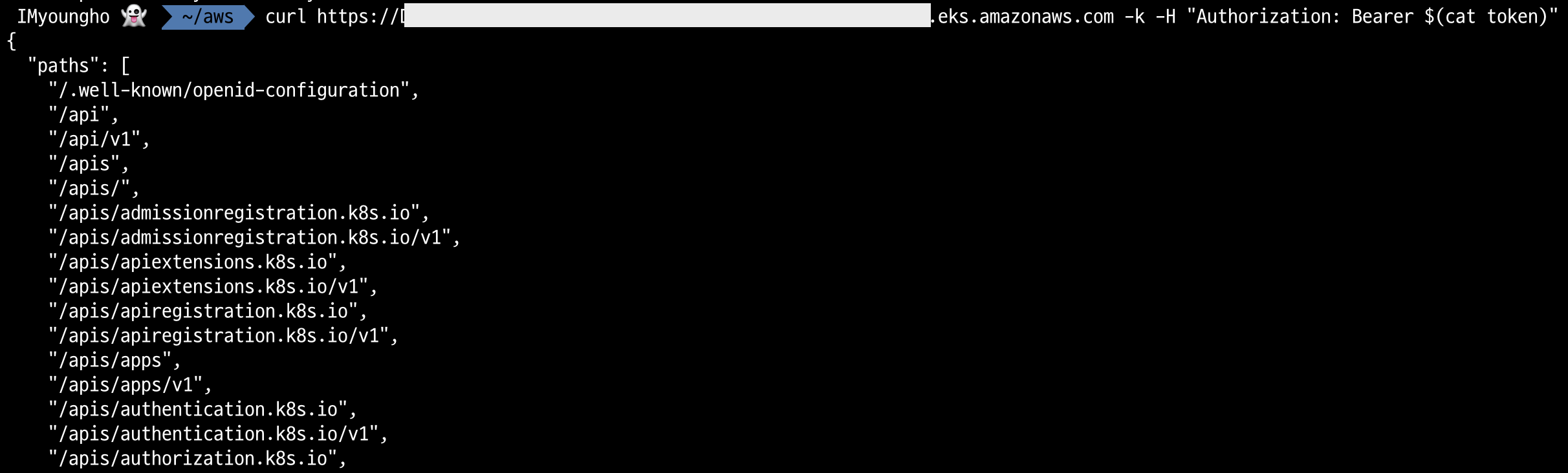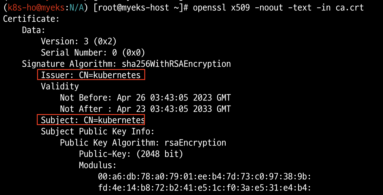 => aws-cli의 describe-cluster를 이용하여 추출한 인증서 내용을 확인해보면 자체서명한 kubernetes ca.crt file이라는 것을 알 수 있었다. 인증서 추출이 귀찮다면 그냥 -k 옵션으로 진행하여 확인해도 무방하다.