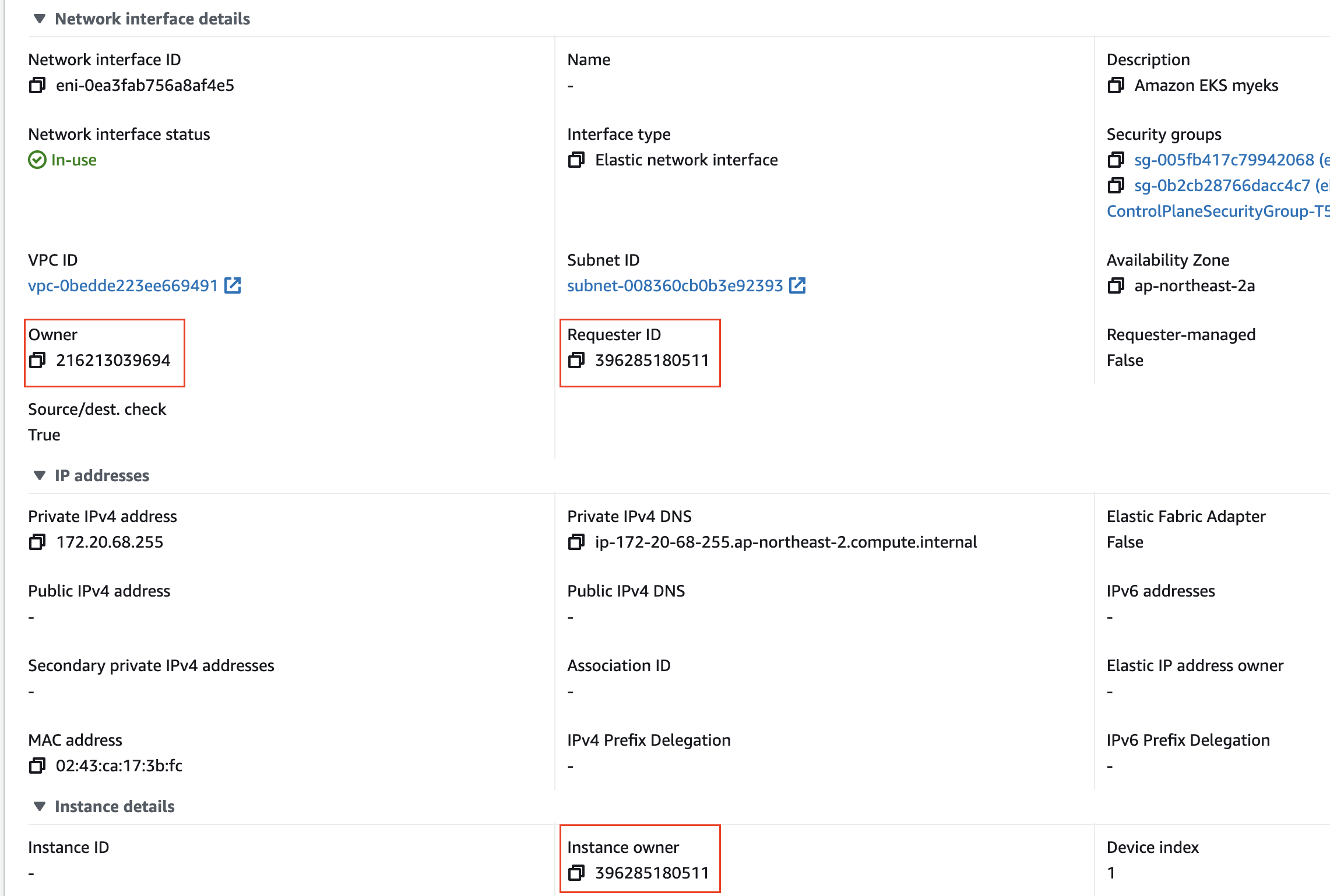 EKS에 존재하는 ENI는 특이한 특징이 있는데 바로 EKS owned ENI로 EKS cluster를 구성하는 Worker node들은 관리자의 소유이지만 해당 Node와 연결된 ENI의 인스턴스는 AWS의 소유라는 것이다.