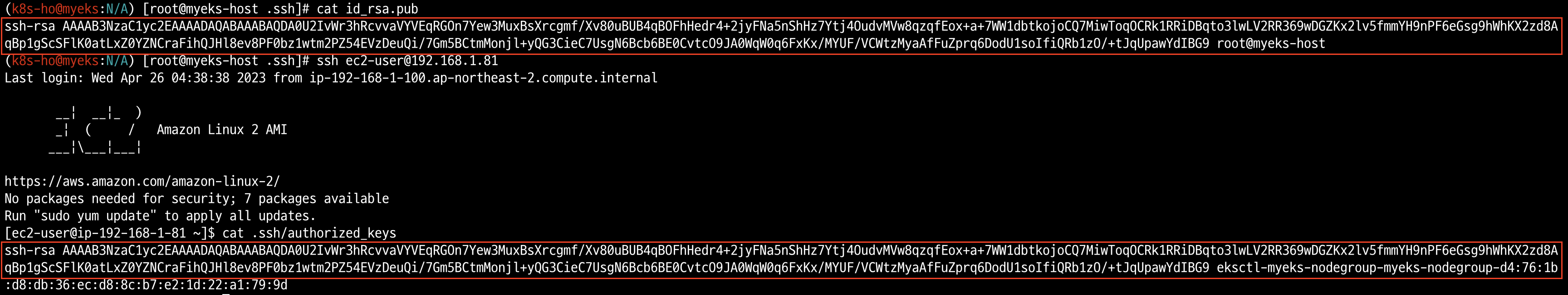 => 관리용 node에서 worker node들로 통신할 수 있도록 securityGroup을 추가해두었다. 참고로 스터디에서는 이미 id_rsa.pub을 각 worker node의 authorized_keys에 등록해놓아서 패스워드 없이 접근이 가능했다