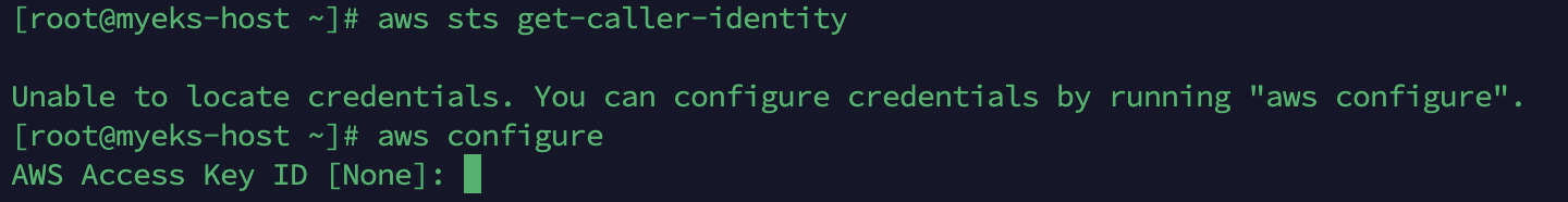 aws configure 명령을 통해 아까 위에서 만든 access key, secret acess key, region을 설정해주고 aws sts get-caller-identity를 통해 정상적으로 설정되었는지 확인하면된다.