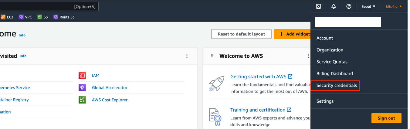 우선 AWS계정은 있다는 가정하에 IAM을 생성해보자. 사실 IAM 생성은 여러 블로그에 방법이 있으니 간략하게 생성해보겠다. 왼쪽 그림과같이 기본적으로 생성한 AWS 계정을 루트 사용자라고 부른다. 이를 이용하여 로그인 후 Security Credentials를 클릭한다.