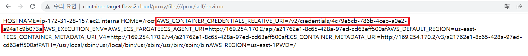 => LFI를 통해서 해당 container의 환경변수관련 파일에 접근이 가능했으며 환경변수에는 AWS_CONTAINER_CREDNTIALS_RELATIVE_URI라는 값이 존재했다. 대놓고 AWS container와 credential과 관련있는 URI라고 써있는게 정답이라고 티내고있다. 그래서 해당 경로로 접근해보았다.