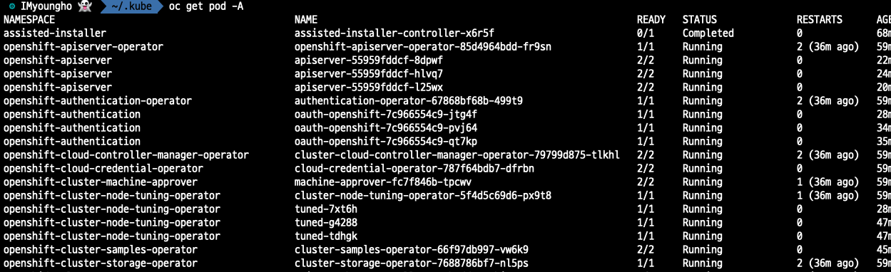 kubectl 또는 oc 명령어를 통해 다음과 같이 Pod가 조회되지 않는다면 .kube/config파일을 다운로드한 kubeconfig 파일로 대체해보자. 우리가 보통 구축해서 사용하던 kubernetes와 다르게 방대한 양의 Pod가 돌고 있는 것을 볼 수 있었다.