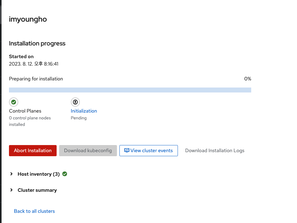 => 어떤설정으로 cluster가 구축될지 preview를 해주고 install을 진행하면 cluster를 생성하기 시작한다. 이 때부터는 그냥 기다리기만하면된다. 내 기준 1시간 정도 걸렸던 것 같다.